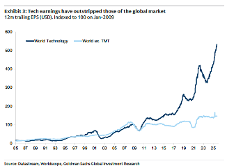 The chart below, supplied by Goldman Sachs, provides a useful perspective regarding the power of tech earnings, particularly over the last decade.