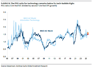 Goldman also notes that valuations, based on forward Price/Earnings to Growth (“PEG”) ratios, are high, but not nearly as extreme as those witnessed in the past.