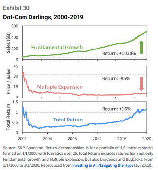 Parallels to the e-commerce and internet boom of the late 1990s are interesting; however, with regard to AI, the potential impact seems less certain. Under some scenarios, AI has far greater societal and economic implications than the internet, while in others the potential is dramatically less. Most importantly, in either case, the implications for investors are significant and generally negative.