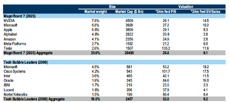 We’ll take no position on the bubble question here. Rather, we are focused on high levels of AI-related index concentration, the context incubating the current cycle, and the implications for public equity returns.